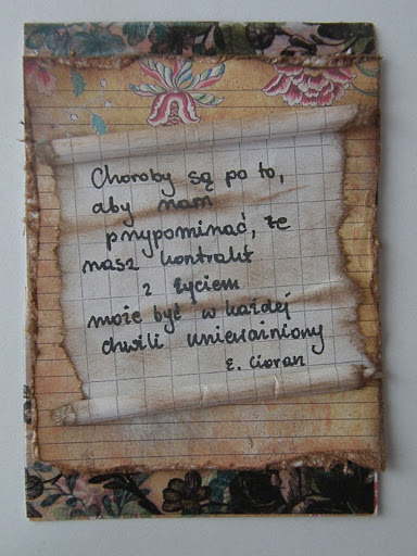 Tak naprawdę to z cytatem dotyczącym choroby. Na wyzwanie Kreatywnego Pola, gdzie KacperM prosi o wykonanie ATC z okazji Światowego Dnia Chorego. Oto i moje ATC