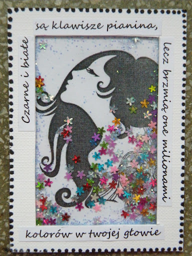 1 praca powstała na wyzwanie z Selenneą - inspiracja cytatem: "Czarne i białe są klawisze pianina, lecz brzmią one milionami kolorów w twojej głowie." Oto moja inspiracja - ATC shaker box